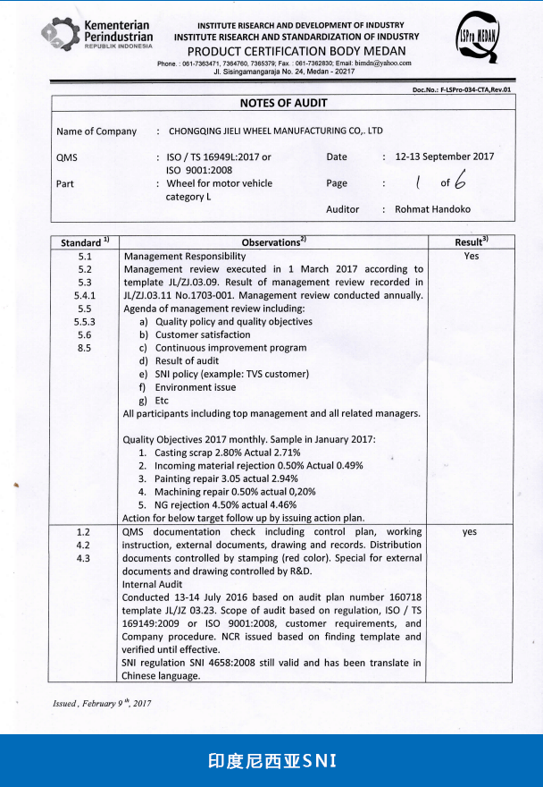 重庆捷力轮毂制造有限公司创建于一九九六年六月,十七年来公司依靠先进的经营管理理念,求真务实,奋力拼搏,一跃成为国内一流的专业生产摩托车铝合金轮毂的现代化企业。公司原址位于重庆九龙坡区盘龙,因企业发展需要于2006年整体搬迁至重庆垫江工业园区。新厂区固定资产投资2亿元,占地200余亩,厂房及配套设施建筑面积8万平方米。拥有各类先进的生产设备370余台套,摩托车铝合金轮毂设计能力达到年产销规模1200万只。 为了实现产品的精良制造,工厂装备了先进的模具设计制造、铸造、热处理、表面涂装、机械加工、装配等生产设备和光电直读光谱仪、金相显微镜、X射线无损探伤仪、强度及耐久性试验机、全套化学分析检测设备等先进的检测仪器和设备,同时建立完备的设计研发手段(CAD/CAM),能够自主研发摩托车铝合金车轮模具及产品,现已拥有专利项目60余项。严格按照ISO9001-2000及TS16949标准建立健全质量管理体系,导入精益生产,六西格玛品质管理等先进管理思想和理念,为产品的高质量,高可靠性提供了有力的保证。 公司现有职工1500余人,其中中高级工程技术人员100余人。自2006年新厂投产以来,生产销售持续兴旺,步步登高,到2012年末更是达到产销摩托车铝合金轮毂900万只,年销售收入超过10亿元。品种上千余个,国内铝轮毂市场占有率排列属首,并远销东南亚、中东、欧美等市场。产品为多家国内国际著名品牌摩托车整车配套(广州五羊本田、大阳、大运、奔马、上海新大洲本田、天津新大洲本田、钱江集团、轻骑集团、北方易初、重庆嘉陵、隆鑫、宗申、鑫源、力帆、建设、银钢、银翔、印度英雄集团、巴西本田、越南本田等),已形成以本市、国内、海外为主的三大市场体系。取得了良好的经济效益,获得了较高的市场知名度,成为业界的知名企业。 重庆捷力轮毂制造有限公司连年被国内外各主机厂评为A级供货商。2002年10月,公司通过ISO9001质量体系认证,2008年12月通过ISO/TS16949质量体系认证,公司在国内外业界享有极高的声誉。 重庆捷力轮毂制造有限公司先后获得中国摩托车零部件优秀企业、重庆工业企业五十强、重庆名牌产品、以及众多摩托车厂家优秀供应商金奖等荣誉和称号。 公司秉持“比过去更好、比同行更好、比顾客期望更好”的企业理念,打造“客户满意、同行尊敬、员工自豪”的公司愿景,坚持“铸造精品、造福社会、精细管理、不断改善、追求卓越”的经营宗旨,不断提升企业的核心竞争力,在经营实践中不断追求完美、追求卓越、竭诚为广大用户服务,共谋发展,共铸辉煌。